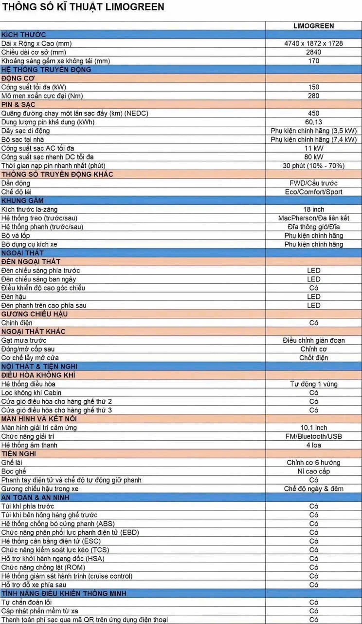 VinFast Limo Green là mẫu xe MPV 7 chỗ mới nhất của VinFast, được ra mắt với mức giá hấp dẫn. Mẫu xe này không chỉ hướng đến khách hàng kinh doanh dịch vụ mà còn phục vụ nhu cầu di chuyển hàng ngày của các gia đình. VinFast Limo Green được trang bị công nghệ điện hoàn toàn, với tầm di chuyển lên đến 450 km sau mỗi lần sạc.