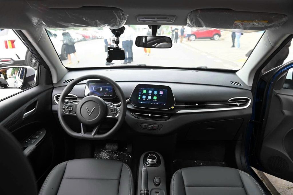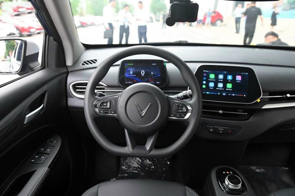 Khoang lái VF 5 được thiết kế rất tối giản với hai màn hình gắn trên bảng táp-lô, hạn chế tối đa các nút bấm vật lý thường thấy. Vô lăng 3 chấu được thiết kế dạng D-Cut thể thao có thể chỉnh cơ 2 hướng. Trên vô lăng cũng được bố trí đầy đủ hệ thống nút bấm điều chỉnh hệ thống Menu, âm lượng, đàm thoại rảnh tay và Cruise Control.